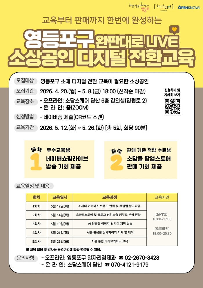 교육은 영등포구 소재 소상공인을 대상으로 오는 5월12~26일 총 5회에 걸쳐 온·오프라인으로 동시에 진행되며, 오프라인 교육은 소담스퀘어 당산(양평로 2) 6층 강의실에서 진행된다.
