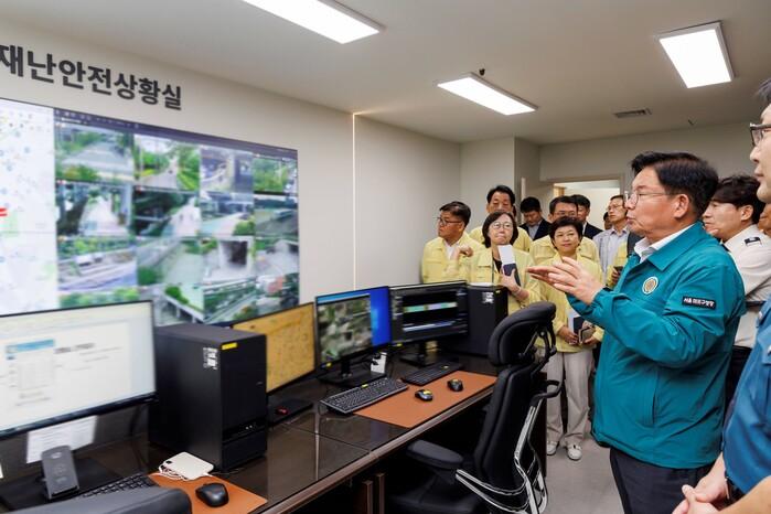 | ▲ 최근 재난안전상황실 관제실에서 재난위험시설을 모니터링 하고 있는 박강수 구청장. (사진=마포구청 제공) |