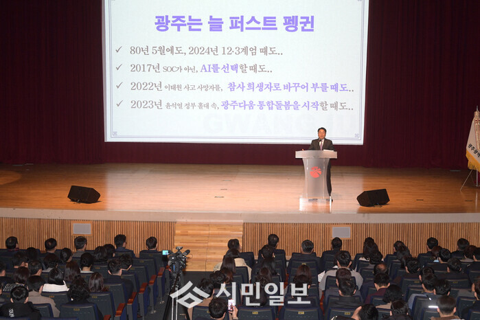 강 시장은 특히 광주를 ‘퍼스트 펭귄’에 비유하며 “광주는 민주주의, 인공지능(AI), 복지, 위기 대응에서 가장 먼저 불확실성에 뛰어든 도시였다”며 “행정통합 역시 지역 주도 성장 국가균형발전의 첫 사례를 만들어내야 한다”고 말했다.
