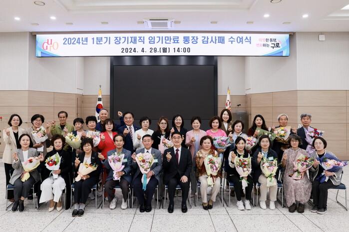 | ▲ 장기재직 임기만료 통장 감사패 수여식 단체 기념사진 (사진=구로구청 제공) |