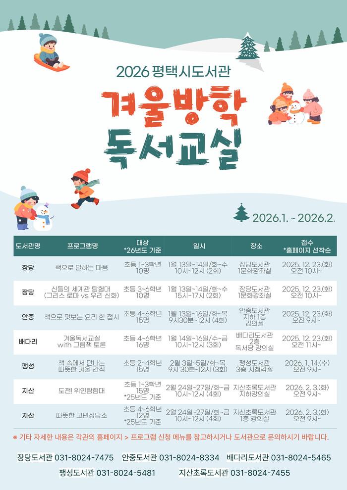 [평택=오왕석 기자] 평택시 도서관은 겨울방학을 맞아 어린이들의 사고력과 창의력 향상을 돕기 위해 ‘2026 겨울방학 독서교실’을 오는 1~2월까지 관내 5개 도서관에서 운영한다고 밝혔다.