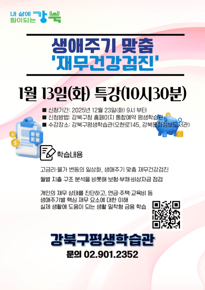 이번에 운영되는 ‘생애주기 맞춤 재무건강검진’ 과정은 오는 1월13일 오전 10시 30분부터 12시까지 강북구 평생학습관에서 진행될 예정이다. 월별 지출 구조 분석을 비롯해 보험·부채·비상자금 점검을 통해 개인의 재무 상태를 진단하고, 연금·주택·교육비 등 생애주기별 핵심 재무 요소에 대한 이해를 돕는 내용으로 구성됐다.