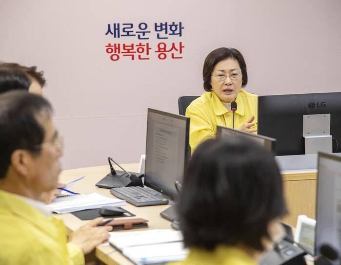 | ▲ 제6호 태풍 '카눈' 대비 대책 회의에서 박희영 구청장이 관련 부서장들에게 철저한 대비를 당부하고 있다. (사진=용산구청 제공) |