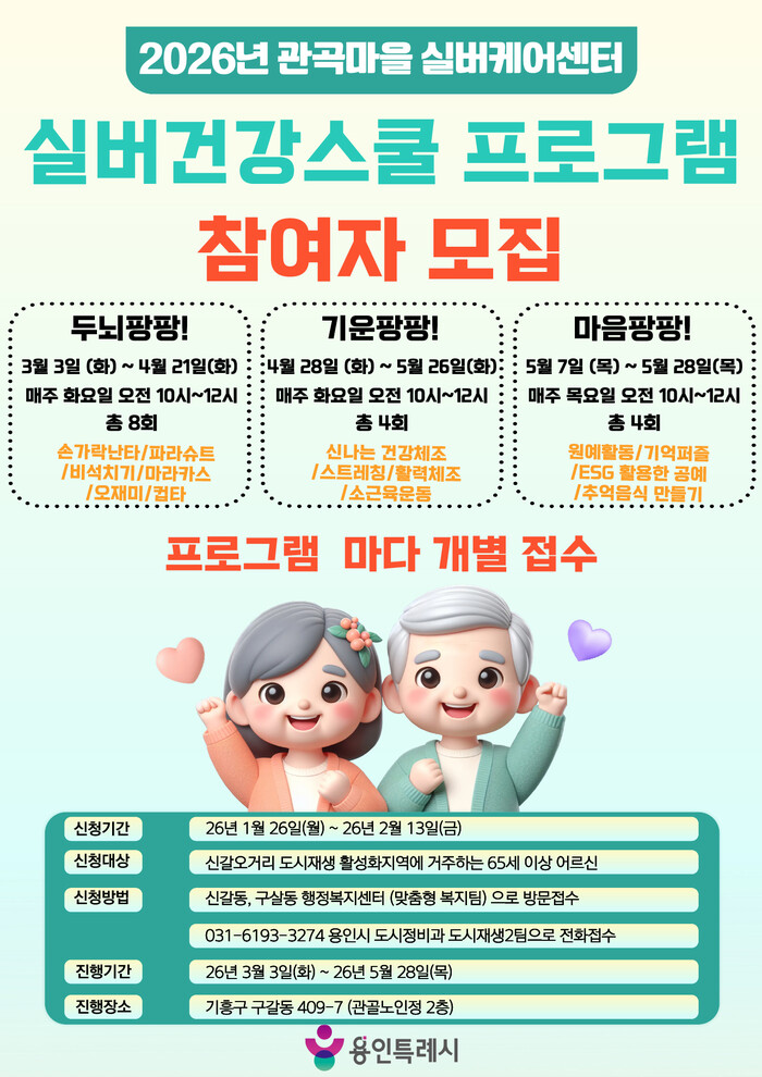 참여 대상은 신갈오거리 도시재생활성화지역에 거주하는 65세 이상 어르신이며, 실버건강스쿨과 실버건강체조 프로그램에 각각 15명을 선착순 모집한다.