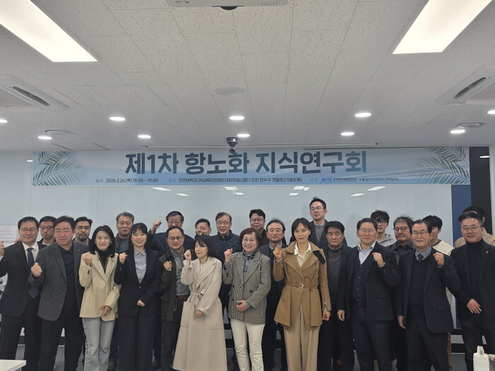 | 2026년도 제1회 항노화 지식연구회 참가자들이 화이팅을 외치고 있다. [사진=인천대] |