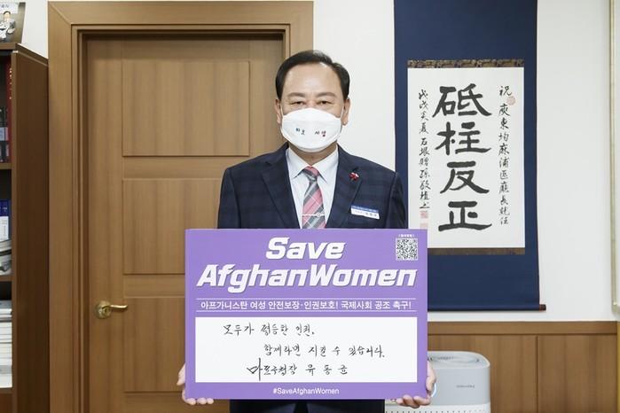 유동균 서울 마포구청장이 지난 20일 아프가니스탄 여성 인권 문제에 대한 국제사회 여론을 형성하기 위한 ‘아프가니스탄 여성 인권보장을 위한 SNS챌린지’에 참여했다. 사진은 유 구청장이 아프가니스탄 여성 인권보장을 위한 SNS챌린지에 참여하고 있는 모습. (사진제공=마포구청)