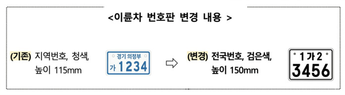 또한 제도 시행 이후 신규 등록 및 재사용 이륜자동차에는 전국번호판이 적용되며, 단순 명의 이전시에는 기존 번호판을 계속 사용할 수 있다.