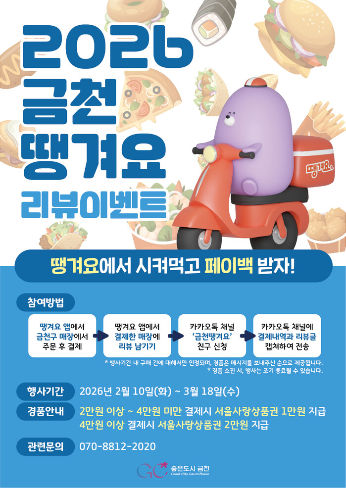 유성훈 구청장은 “설 명절을 앞두고 위축된 소비를 회복하고 지역 상권에 활력을 불어넣기 위해 공공배달앱과 금천땡겨요상품권을 연계한 지원책을 마련했다”라며, “주민들이 체감할 수 있는 혜택을 통해 지역 경제에 실질적인 도움이 되는 정책을 지속적으로 추진하겠다”라고 말했다.
