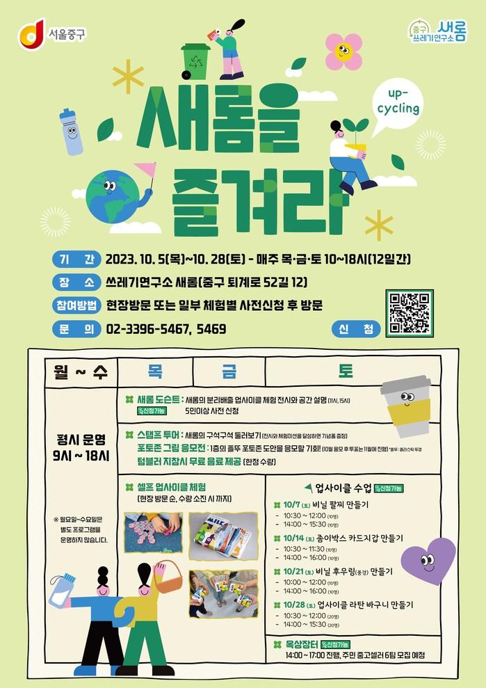 ‘새롬을 즐겨라’는 5~28일 매주 목·금·토요일에 새롬에서 진행된다. 이번 ‘새롬을 즐겨라’는 방문하는 사람들이 직접 보고 즐길 수 있는 체험형 프로그램 위주로 구성됐다. ▲업사이클 체험 ▲스탬프 투어 ▲포토존 그림 응모전 등 다양한 이벤트가 준비돼있다.