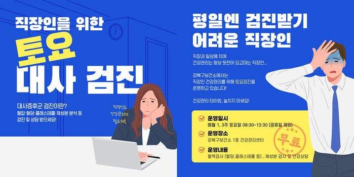 [시민일보 = 문민호 기자] 서울 강북구(구청장 이순희) 보건소 건강관리센터가 ‘직장인 맞춤형 토요 대사증후군 검진 서비스’를 운영하고 있다고 29일 밝혔다.