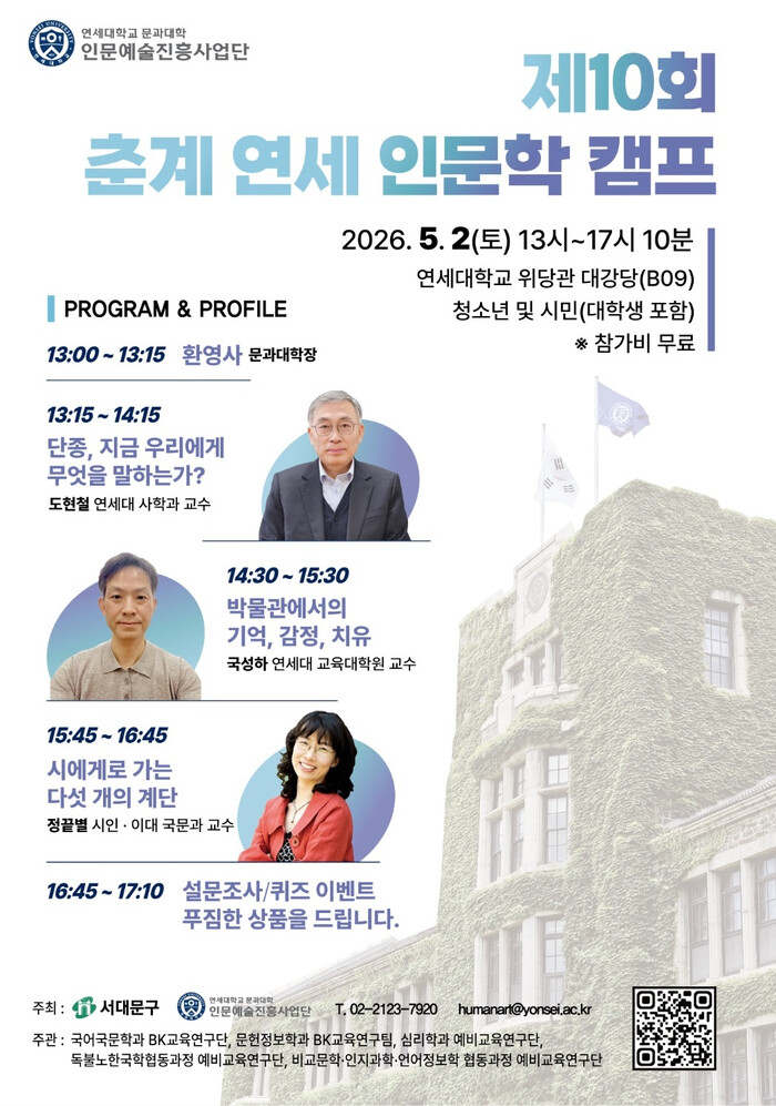 오는 5월2일 오후 1시~5시10분 연세대 위당관 대강당(B09호)에서 열리는 이번 캠프는 인문학적 소양을 넓히려는 초중고교생과 대학생, 학부모, 일반시민 등 누구나 무료로 참여할 수 있다.