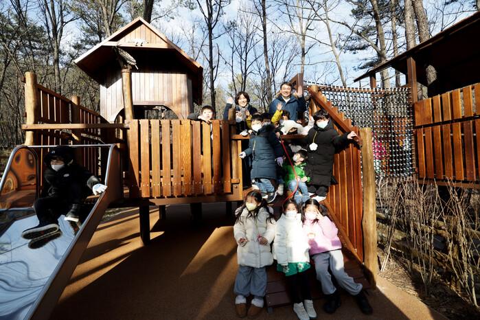 오승록 서울 노원구청장이 지난 22일 수락산 동막골 일대에 조성된 ‘수락산 유아숲체험원’ 준공식에 참석했다. 이날 개장식은 국회의원, 시,구의원, 지역 주민 등 100여명이 참석했다. 사진은 오 구청장이 나무놀이터에서 어린이들과 기념 촬영을 하는 모습. (사진=노원구청 제공)