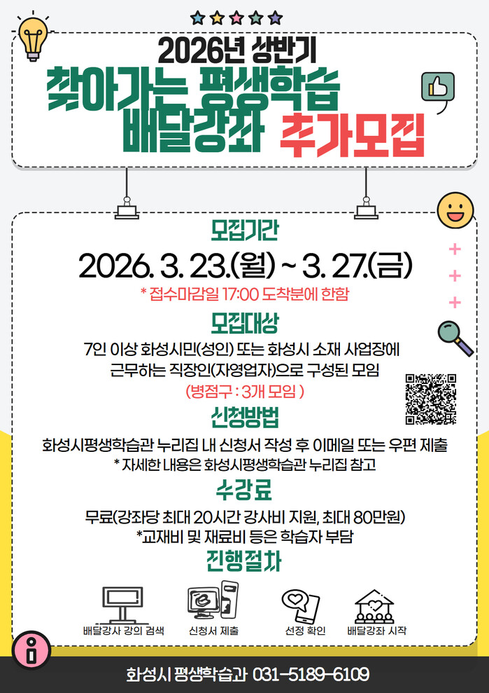 [화성=송윤근 기자] 경기 화성시가 시민의 다양한 학습 수요를 반영한 맞춤형 평생학습 프로그램 운영을 위해 ‘2026년 상반기 찾아가는 평생학습 배달강좌’ 수강생을 추가 모집한다고 밝혔다.