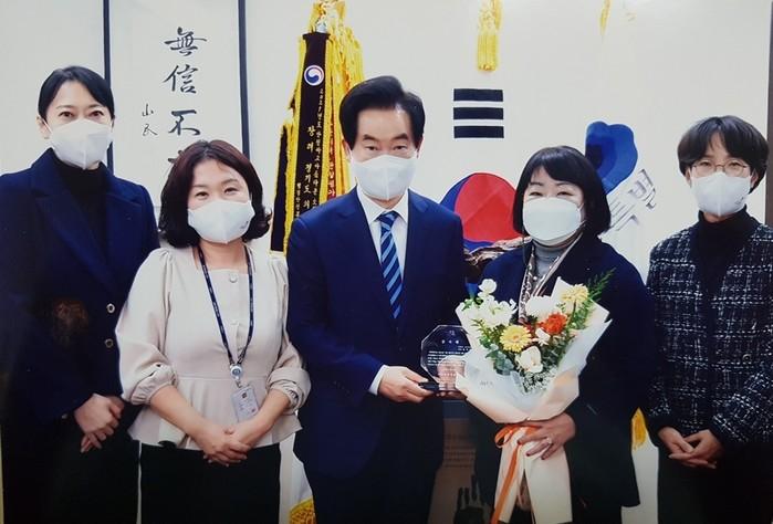경기 의정부시는 최근 여성친화도시 조성을 위한 공로의 뜻으로 강미애 전(前) 여성친화도시 시민서포터즈 여의주 대표에게 감사패를 전달했다. 강 전 대표는 2013년부터 대표로 활동하며 일상생활에서의 성별 불균형 발굴 및 성인지 역량 교육 등을 실시했다. 사진은 전달식에서 안병용 시장(가운데)과 수상자 및 관계자들이 기념촬영을 하는 모습. (사진제공=의정부시청)