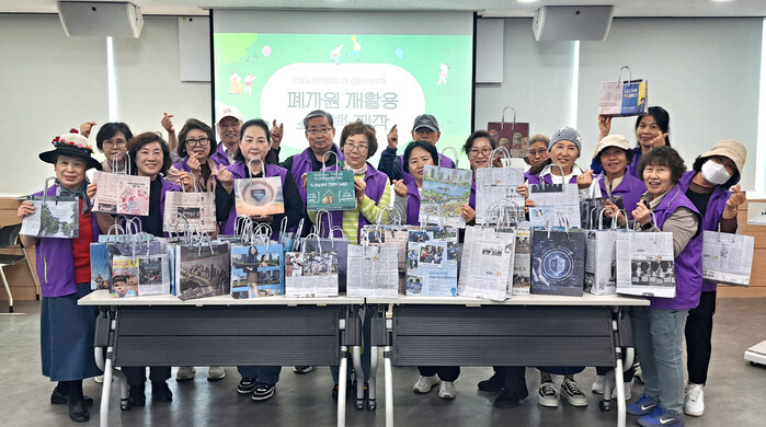 | ▲ 폐신문지를 활용한 재활용 가방 제작에 참여한 참여자들이 직접 만든 종이가방을 들어보이며 기념촬영을 하고 있다. (사진=은평구청 제공) |