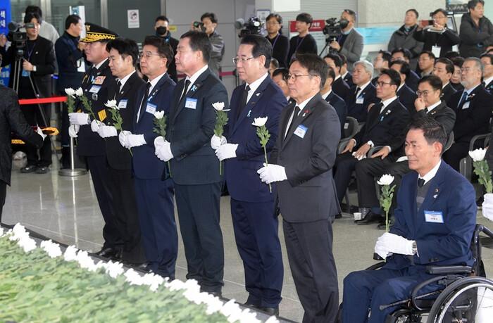 [광주=정찬남 기자] 강기정 광주광역시장(오른 쪽부터 두 번째)이 29일 오전 무안국제공항에서 열린 12.29제주항공 여객기 참사 1주년 추모식에 참석해 헌화와 묵념을 하고 있다. /광주광역시 제공