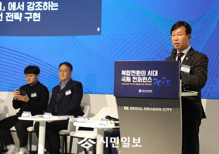 | ▲ 박병규 광주광역시 광산구청장이 지난 10일 서울 드레곤시티에서 개최된 복합전환의 시대 국제컨퍼런스에 참석해 광산구 복합 전환 시대 노동시장 해법 국제 컨퍼런스 사례를 발표하고 있다. / 광주광역시 광산구청 제공 |