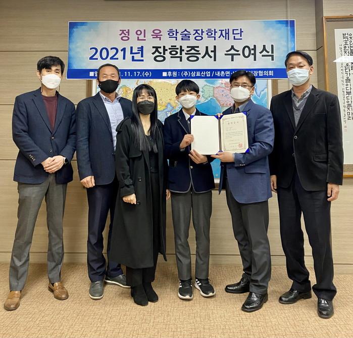 경기 포천시 내촌면은 17일 재단법인 정인욱 학술장학재단 인재장학금 수여식을 개최했다. 이 장학금은 어려운 환경에서 학업에 정진하는 내촌면 중고생 및 대학생들에게 지급되는 것으로, 이날 각 리에서 추천된 성적 우수학생 29명과 저소득층 학생 10명 등 총 41명에게 2600만원이 전달됐다. 사진은 수여식에서 장학생 및 관계자들이 기념촬영을 하는 모습. (사진제공=포천시청)