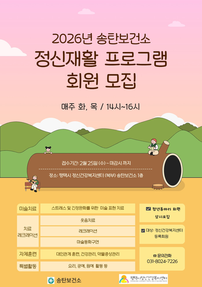[평택=오왕석 기자] 평택시 정신건강복지센터(송탄보건소)는 만 19세 이상 등록회원을 대상으로 ‘2026년 정신재활 프로그램’을 운영한다고 밝혔다. 이번 프로그램은 정신질환자의 사회적응 능력을 키우고 정신건강 증진을 도모하기 위해 마련됐다.