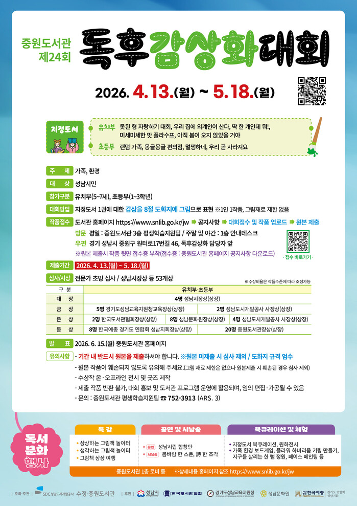 [성남=오왕석 기자] 성남도시개발공사(사장직무대행 박경섭) 중원도서관은 ‘2026년 도서관의 날·도서관주간’을 맞아 오는 4월 13일부터 5월 18일까지 ‘제24회 독후감상화대회’를 개최한다고 26일 밝혔다.