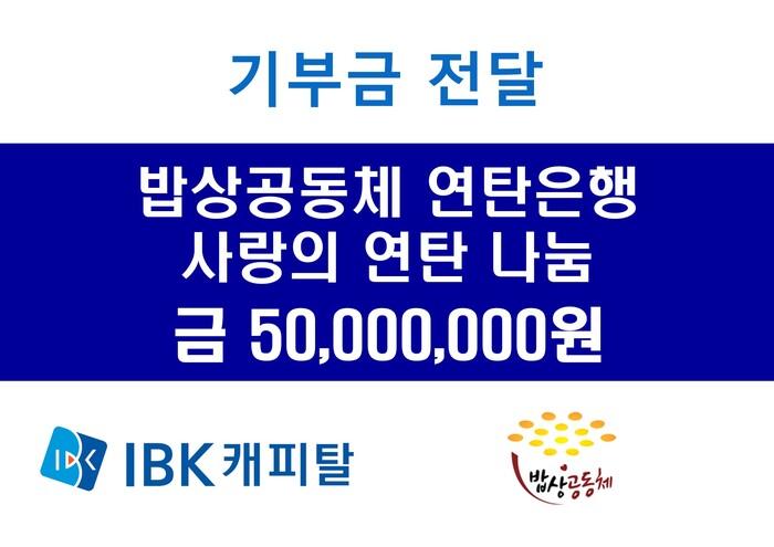[시민일보 = 박소진 기자] IBK캐피탈은 지난 26일 밥상공동체 복지재단 서울연탄은행에 연탄 나눔 기금 5000만원을 전달했다고 28일 밝혔다.