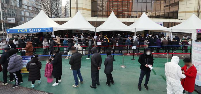제20대 대통령선거가 치러지는 9일, 30만명이 훌쩍 넘는 역대 최다 확진자가 발생한 가운데 서울 송파구 보건소 선별진료소에서 시민들이 검사를 기다리고 있다.