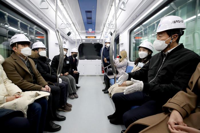 오세훈 서울시장이 3일 오전 서울 동작구 신림선 도시철도 건설 현장을 찾아 열차를 시승하고 있다.