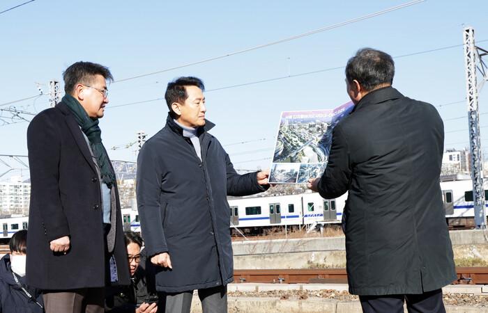 오승록 서울 노원구청장이 3일 창동차량기지 내부에서 열린 ‘진접차량기지 종합시험운행 개시 행사’에 참석해 창동차량기지 이전 본격화를 알리는 뜻깊은 순간을 함께했다. 사진은 오 구청장(맨 왼쪽)이 오세훈 서울시장과 함께 창동차량기지일대 개발 비전을 살펴보는 모습. (사진=노원구청 제공)