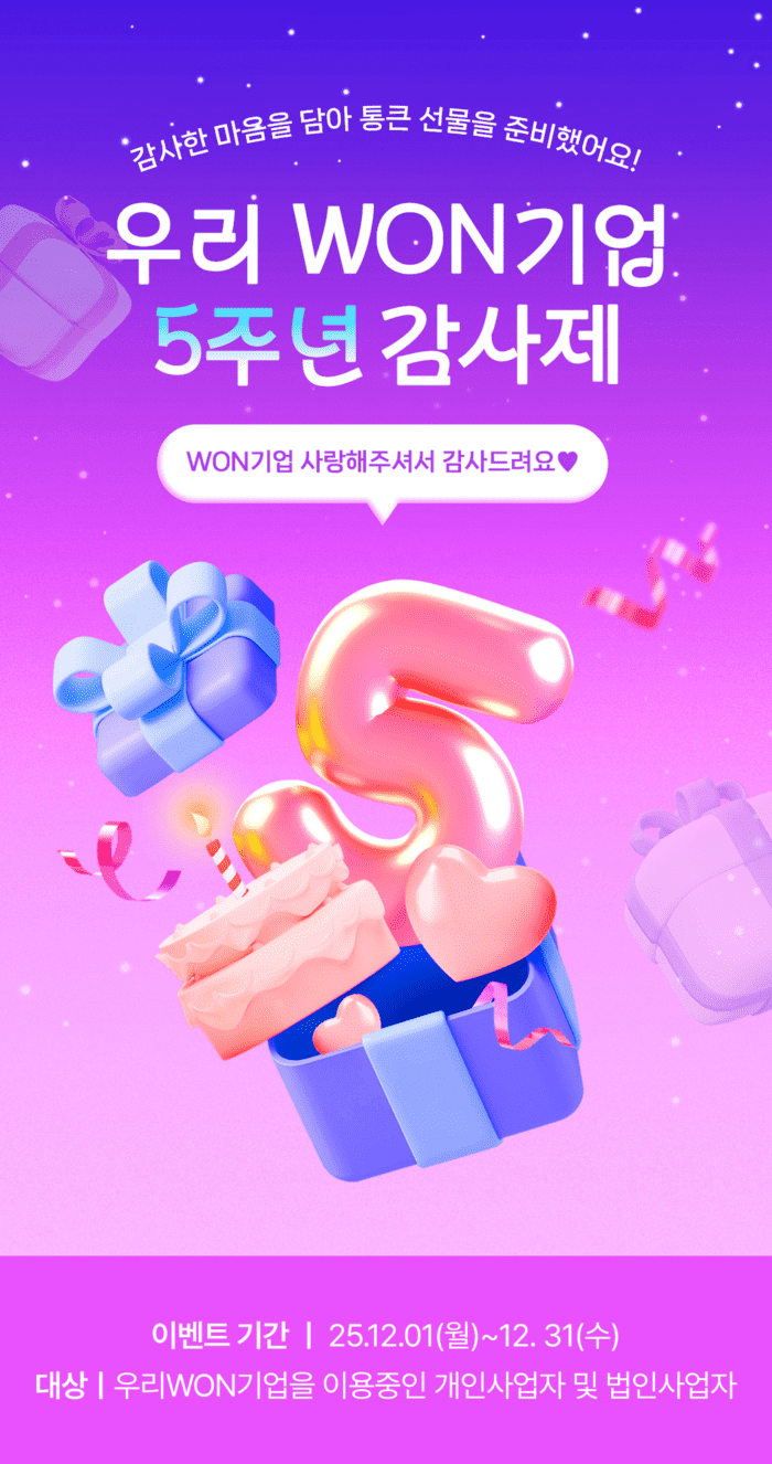 [시민일보 = 박소진 기자] 우리은행은 기업 모바일 플랫폼 ‘우리WON기업’ 출시 5주년을 맞아 12월1일부터 31일까지 한 달간 감사 프로모션 이벤트를 진행한다고 밝혔다.