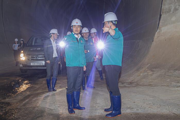 | ▲ 29일 오전 신월빗물저류배수시설 지하 3.6km 구간에 직접 들어가 풍수해 대비 현장점검 중인 이기재 양천구청장 (사진=양천구청 제공) |