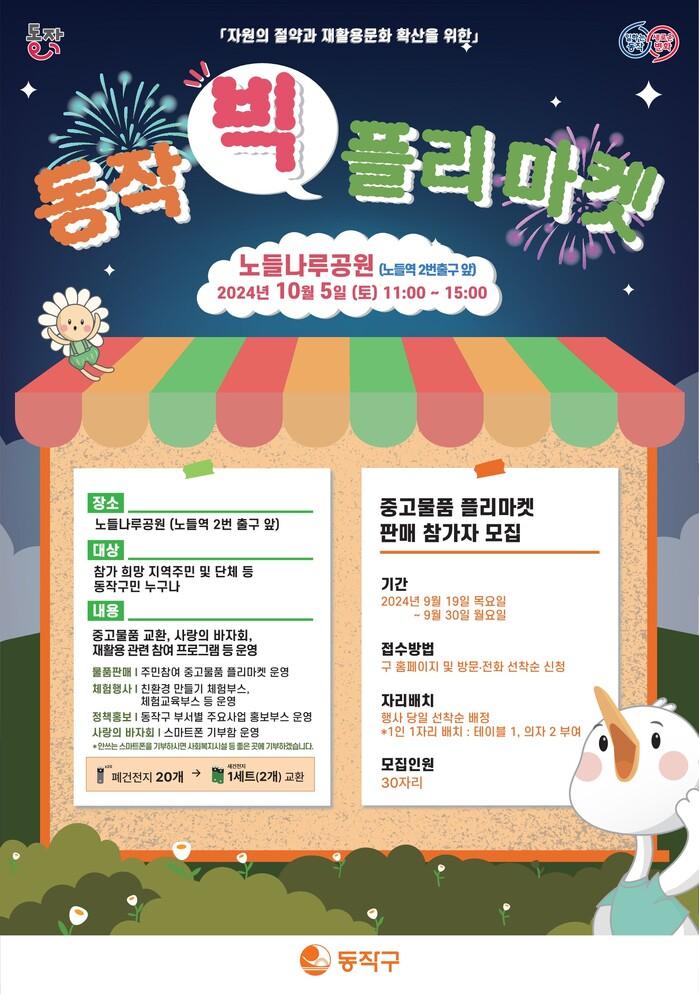 ‘동작빅플리마켓’은 가정에서 사용하지 않거나 재사용 가능한 물품을 주민들이 직접 사고 파는 나눔 장터로, 재활용 문화를 확산하고 자원순환 활성화에 기여하고자 기획됐다.