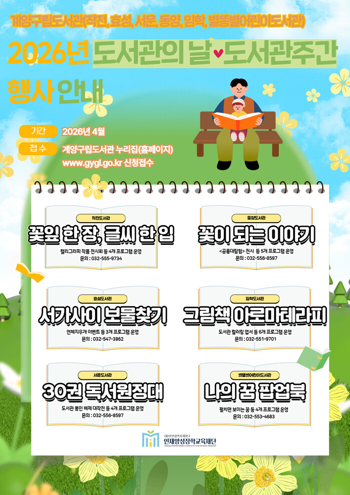 [인천=문찬식 기자] 인천 계양구립도서관[(재)인천광역시계양구인재양성장학교육재단]은 오는 4월 도서관의 날·도서관주간을 맞아 지역주민의 도서관 이용 활성화를 위해 다양한 독서문화 행사를 운영한다고 밝혔다.
