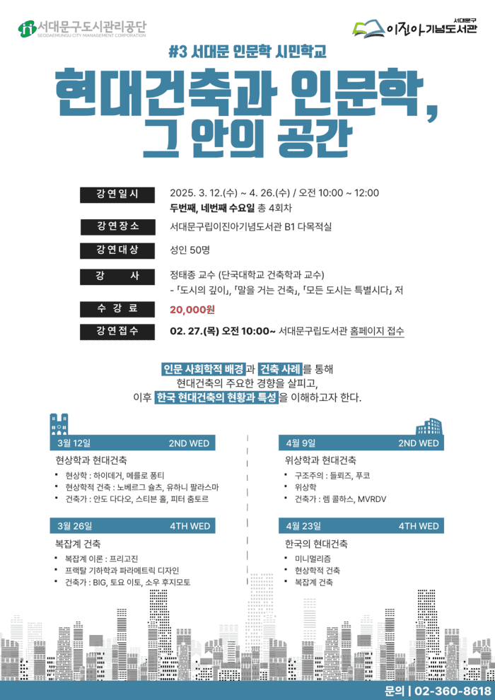 2025년 상반기 『서대문 인문학 시민학교』는 현대건축이라는 주제에 인문학적으로 다가가기 위해 현대 건축물에 대한 인문사회학적 배경과 건축 사례를 살펴보는 인문학기반 독서프로그램으로 운영될 예정이다.