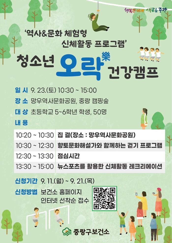 [시민일보 = 여영준 기자] 서울 중랑구(구청장 류경기)가 오는 23일 청소년들의 건강한 성장을 돕는 ‘청소년 오락(樂) 건강 캠프’를 개최한다.