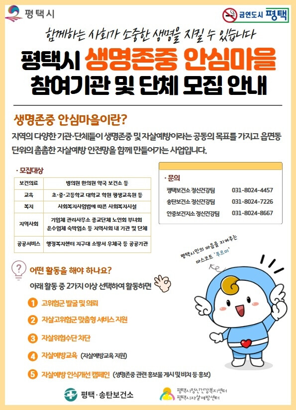 평택시 평택·송탄보건소는 자살 고위험군을 미리 발굴하고 맞춤형 지원을 제공하는 「생명존중 안심마을」 사업을 지속적으로 확대 운영함과 동시에, 사업에 함께 참여할 지역 내 공공기관과 민간기관을 모집한다고 밝혔다.
