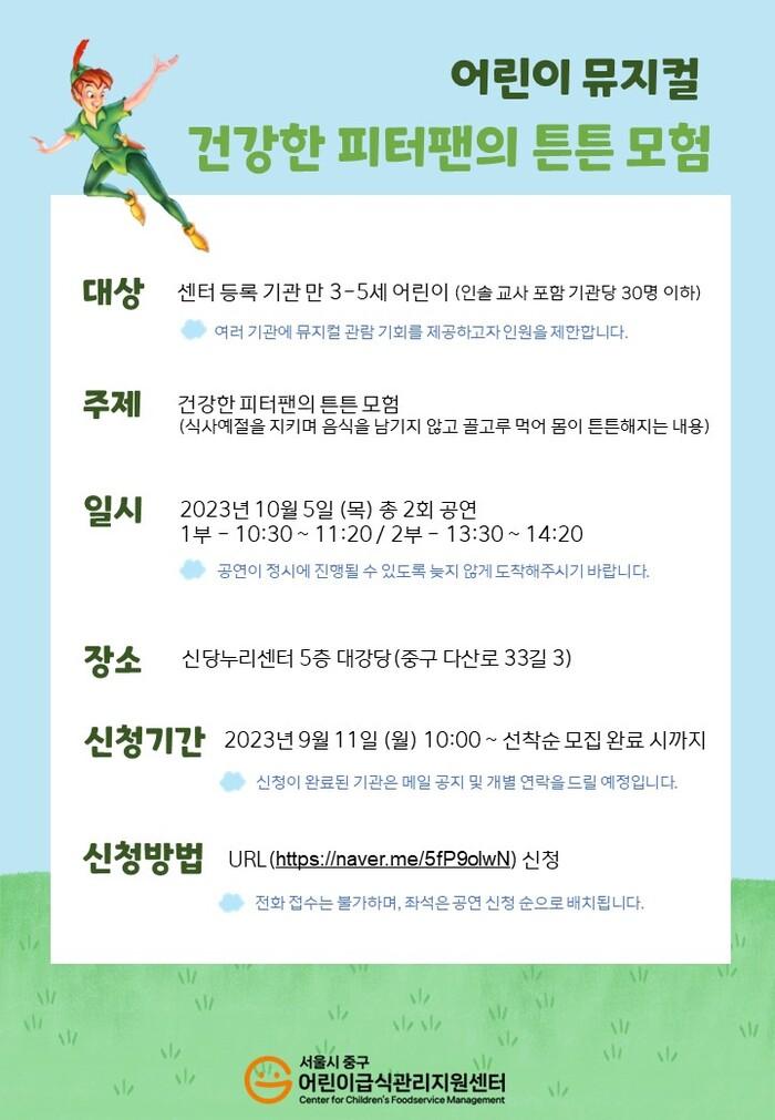 [시민일보 = 여영준 기자] 서울 중구(구청장 김길성)가 어린이의 건강한 식생활 습관 형성을 돕기 위해 ‘건강한 피터팬의 튼튼 모험!’ 뮤지컬 공연을 진행한다.