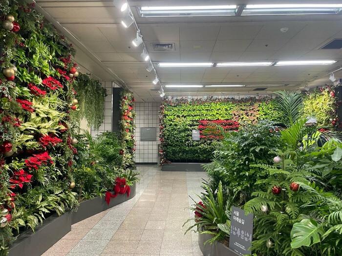 이번 크리스마스를 맞아 두 역사의 ‘서울 아래숲길’ 전 구간을 금빛 장식 공과 벨벳 리본 등으로 꾸미고, 겨울을 상징하는 빨간 포인세티아 꽃을 곳곳에 배치했다.