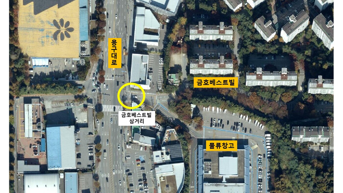 현장 점검 결과, 용구대로에서 금호베스트빌 방향으로 진입하는 도로가 차량 회전반경을 충분히 고려하지 못한 구조로 설계돼 있어 차량 진·출입 시 혼잡과 사고 위험이 높은 것으로 확인됐다. 특히, 인근 삼성웰스토리 물류센터로 진입하는 대형 화물차 통행이 잦아 일반 차량과 보행자가 혼재되며 안전 우려가 지속적으로 제기돼 왔다.