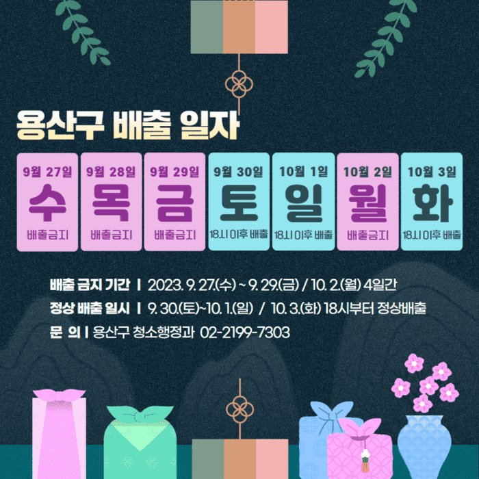 구 관계자는 "연휴기간 운영하는 병·의원과 약국 정보를 구 홈페이지나 SNS에 게재하니 참고하시기 바란다"며 "특히 9월27~30일, 10월2일 총 4일은 쓰레기 수거가 불가하다. 금지일 다음날 오후 6시부터 집 앞에 쓰레기를 배출하시기 바란다"고 말했다.