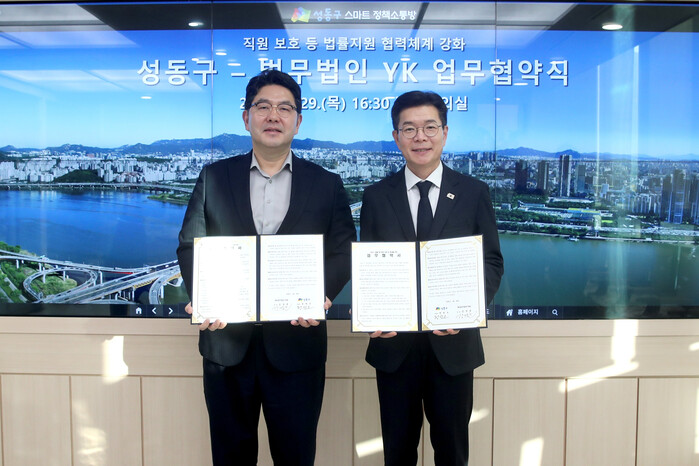 [시민일보 = 박소진 기자] 성동구(구청장 정원오)가 최근 직원 보호 등 법률 지원 협력체계 강화를 위해 법무법인 YK와 업무협약을 체결했다고 밝혔다.