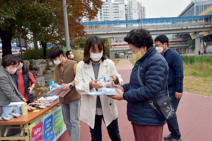 경기 의정부시 호원2동행정복지센터가 최근 안전점검의 날을 맞아 회룡천 일원에서 '매월4일은 안전점검의 날' 및 단계적 일상회복 전환에 따른 시민협조사항을 홍보하는 안전문화 캠페인을 전개했다. 사진은 이날 캠페인에서 시민들에게 홍보물을 나눠주고 있는 모습. (사진제공=의정부시청)