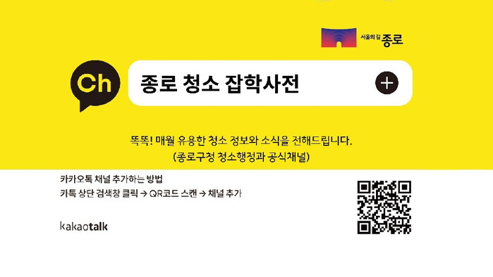 [시민일보 = 이대우 기자] 서울 종로구(구청장 정문헌)가 카카오톡 채널을 통해 청소 정보를 쉽고 빠르게 받아볼 수 있는 ‘종로 청소 잡학사전’운영에 들어갔다.