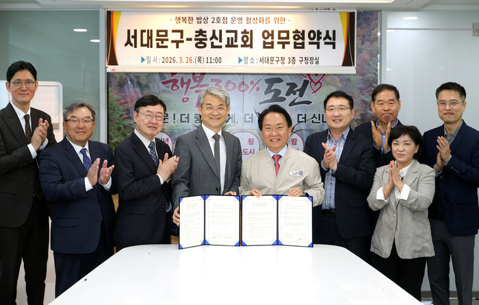 서울 서대문구가 지역 노인복지 증진과 꾸준한 급식 서비스 제공을 위해 지역내 북가좌2동에 소재한 충신교회와 ‘행복한 밥상 2호점’ 운영 활성화를 위한 업무협약을 체결했다. 사진은 협약 후 기념촬영 모습. (사진=서대문구청 제공)