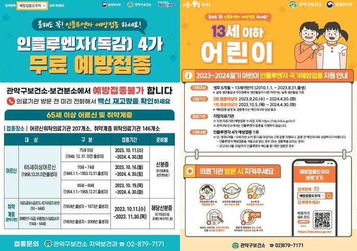 [시민일보 = 여영준 기자] 서울 관악구(구청장 박준희)가 20일부터 오는 2024년 4월까지(취약계층은 11월까지) 어린이, 임신부, 어르신 등을 대상으로 독감 예방접종을 무료로 실시한다.
