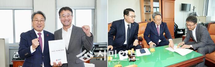 | ▲ 강기정 광주광역시장이 19일 국회를 방문해 한병도 예산결산위원장에게 '2026년도 광주시 핵심 국비 사업'의 필요성을 설명하고 내년도 예산에 추가 반영될 수 있도록 요청하고 있다. /광주광역시 제공 |