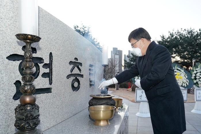 신동헌 경기 광주시장은 3일 임인년(壬寅年) 새해를 맞이해 현충탑을 찾아 참배하고 순국선열과 호국영령의 숭고한 넋을 기리고 광주시 발전을 위한 각오와 결의를 다졌다. 사진은 이날 신 시장이 현충탑에서 분향을 하고 있는 모습. (사진제공=광주시청)