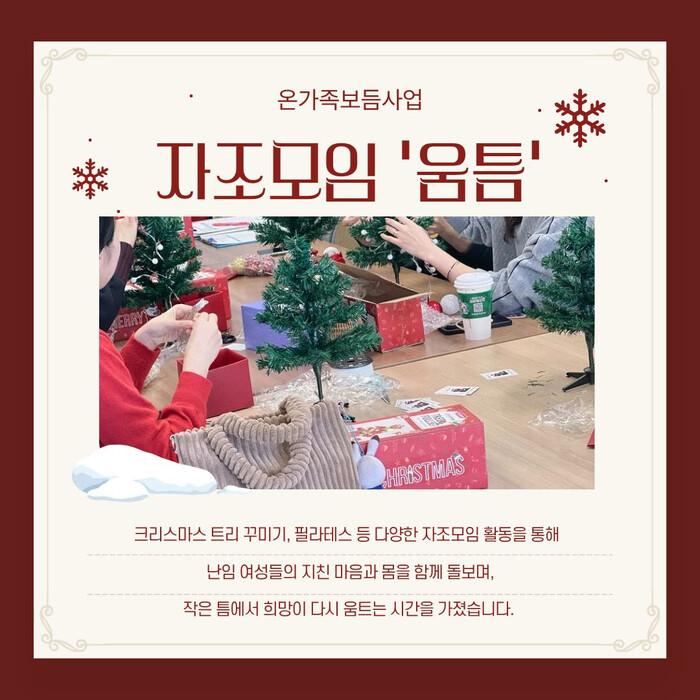 [인천=문찬식 기자] 인천동구가족센터(센터장 박미희)는 난임 여성의 심리적 부담을 줄이기 위해 온가족보듬사업 자조모임 ‘움틈’을 11월 14일~12월 12일까지 운영하였다고 밝혔다.