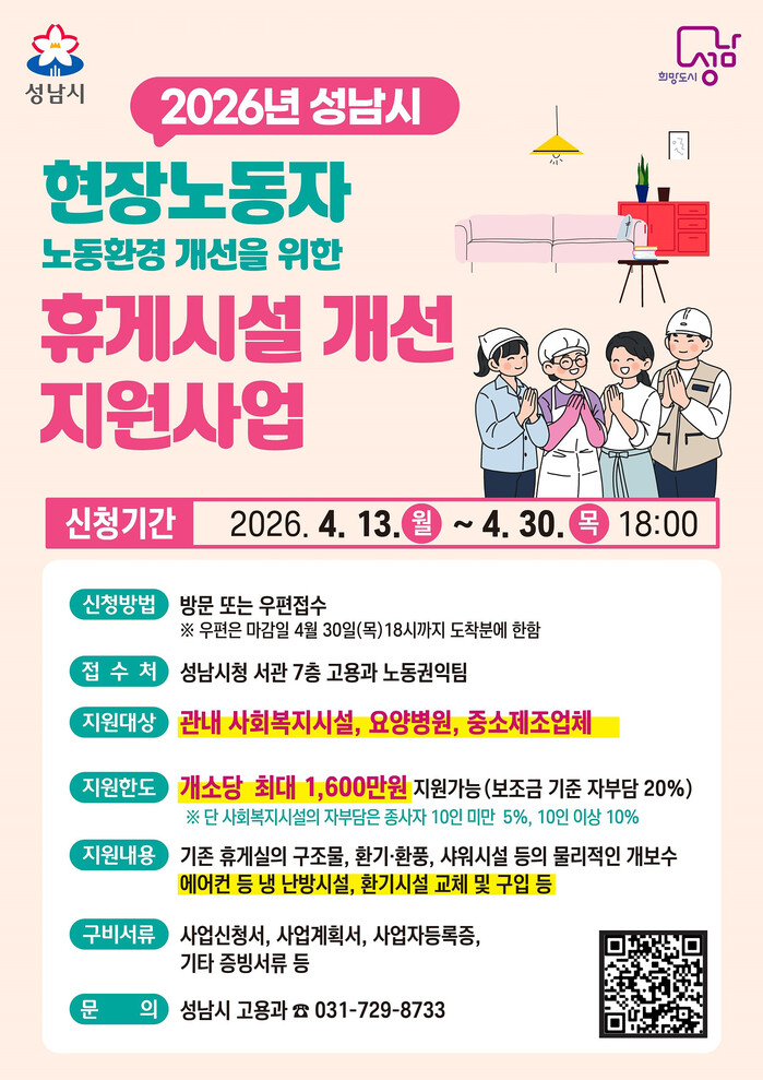 [성남=오왕석 기자] 성남시(시장 신상진)는 휴게 여건이 열악한 민간 분야 현장노동자의 휴게권 보장과 노동환경 개선을 위해 사업장 휴게시설 개선 지원사업 참여기관과 기업을 추가 모집한다.