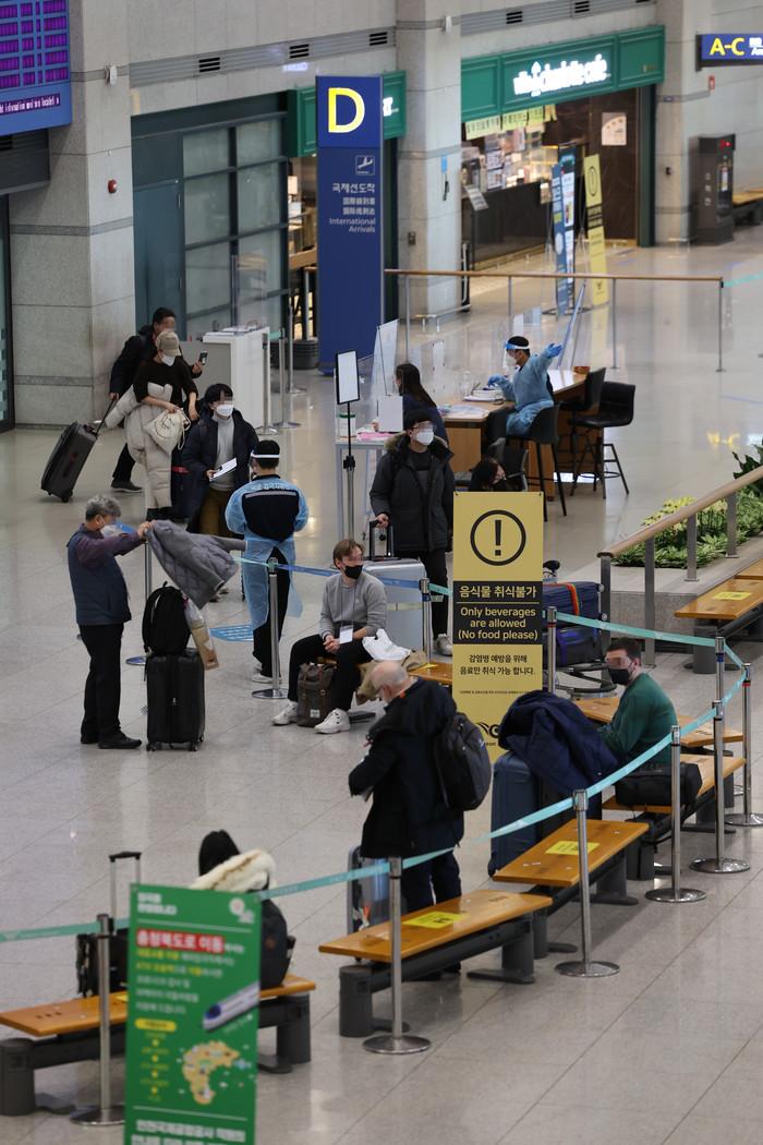 해외유입 신규 확진자가 381명을 기록한 16일 인천국제공항을 통해 입국한 해외입국자들이 자가격리시설로 향하는 버스를 기다리고 있다. 이날 해외유입은 381명은 지난 14일 407명, 13일 390명을 이어 역대 세 번째로 많은 규모다.