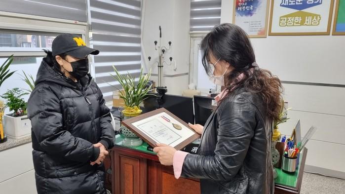 경기 의정부시 송산1동 주민센터는 최근 2021년 우리동네 천사통장 활동 우수자를 표창했다. 이날 동(洞)복지행정분야에 최기영 통장(54통), 자원발굴 분야에 김은신 통장(31통), 복지사각지대 발굴 분야에 신영수 통장(11통)이 수상했다. 사진은 표창을 수여하고 있는 모습. (사진제공=의정부시청)